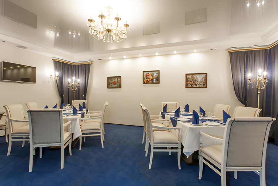 Ресторан «Времена года» до 80 человек. Интерьер зала выполнен в современном классическом стиле, а окна с подсветкой и зеркальная колонна позволяют при помощи светотехники создавать удивительные визуальные эффекты. Цветовое решение в пастельных тонах дает возможность оформить зал в любой цветовой гамме. VIP-зал до 15 человек. Интерьер зала выполнен в русском стиле. Лепнина и бра на стенах создают ощущение роскоши.